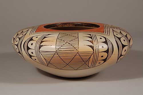 She was the daughter-in-law of Paqua Naha (the first Frog Woman). Helen was married to Paqua’s son Archie. She was mostly self-taught, following the style of her mother-in-law and sister-in-law Joy Navasie (second Frog Woman). Her designs are often based on fragments found at the Awatovi ruins near Hopi. Her hallmark style was finely polished, hand-coiled pottery finished in white slip with black and red decorations. She would often take the extra step to polish the inside of a piece as well as the outside.